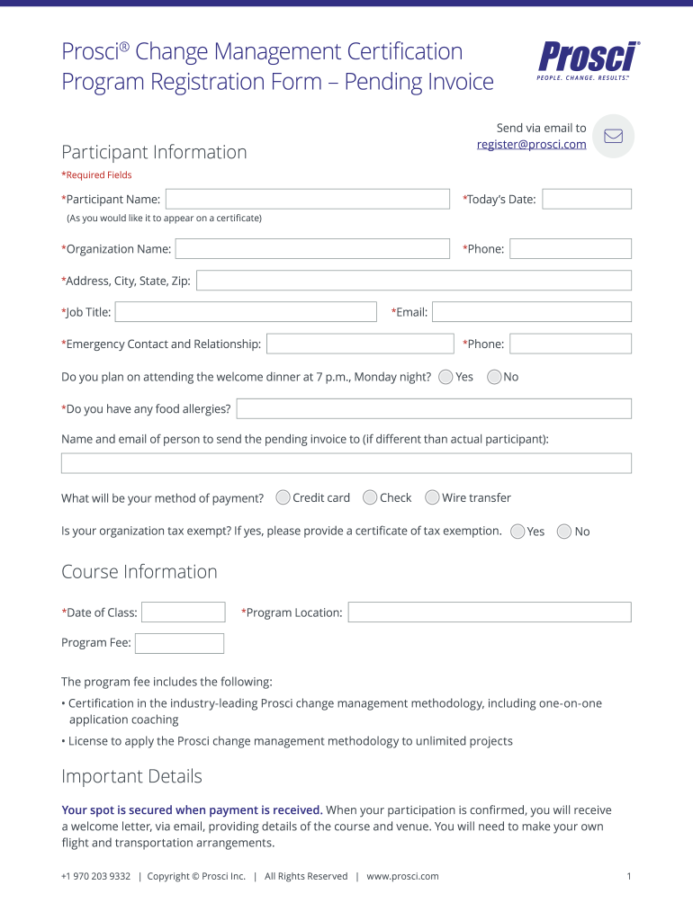 Pro sci Change Management Certification Program Registration Form Pending Invoice Send via email to register pro sci. Nonparticipant Information *Required Fields *Participant×TodaysName:Date:(As