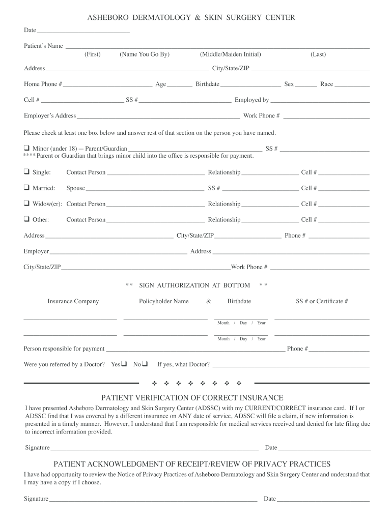 ASHEBORO DERMATOLOGY & SKIN SURGERY CENTER Date Patients Name (First) (Name You Go By) (Middle/Maiden Initial) (Last) Address City/State/ZIP Home Phone # Age Birthdate Sex Race Cell # SS # Employed