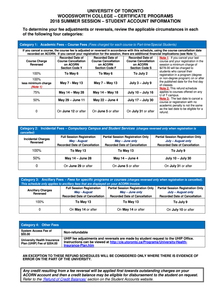 UNIVERSITY OF TORONTO WORDSWORTH COLLEGE CERTIFICATE PROGRAMS 2018 SUMMER SESSION STUDENT ACCOUNT INFORMATION To determine your fee adjustments or reversals, review the applicable circumstances in