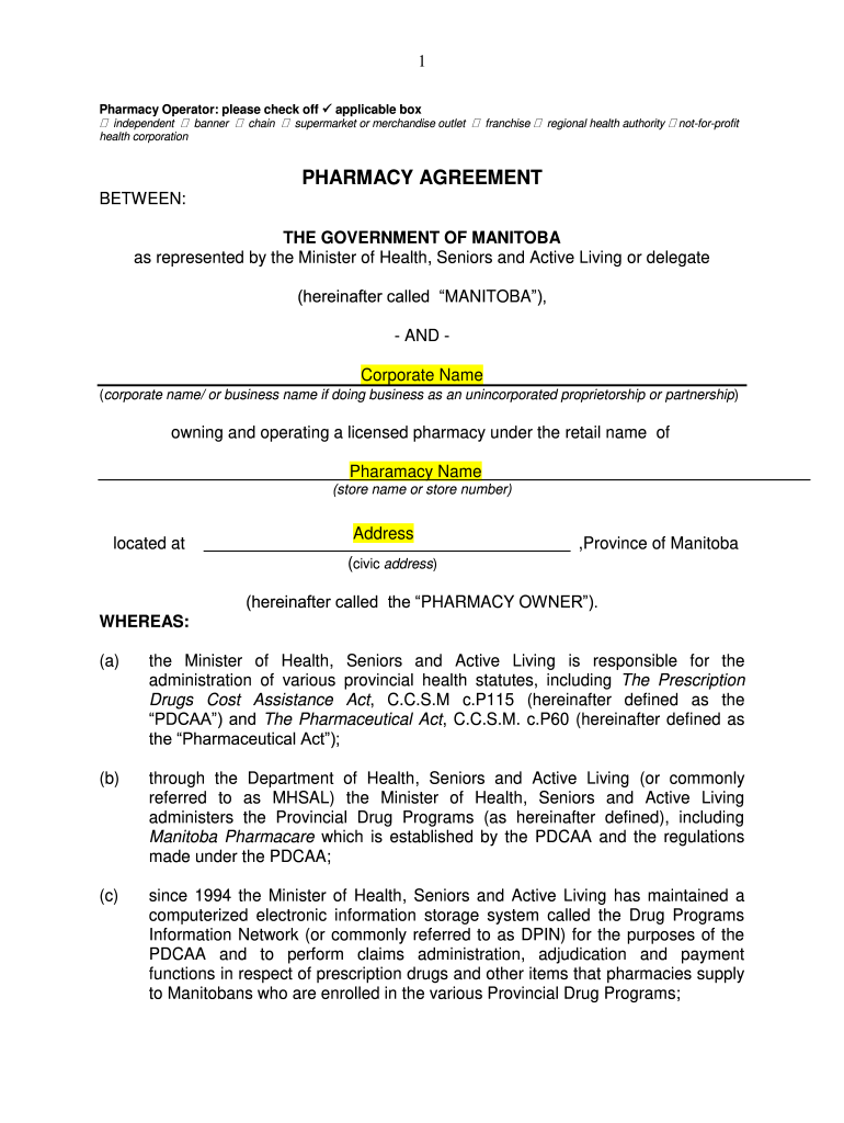 1 Pharmacy Operator: please check off applicable box independent banner chain supermarket or merchandise outlet franchise regional health authority notforprofit health corporationPHARMACY AGREEMENT