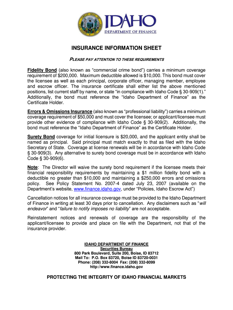 INSURANCE INFORMATION SHEET PLEASE PAY ATTENTION TO THESE REQUIREMENTS Fidelity Bond (also known as commercial crime bond) carries a minimum coverage requirement of $200,000. Maximum deductible allowed