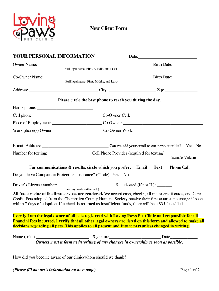New Client Former PERSONAL Informational:Owner Name: Birth Date: (Full legal name: First, Middle, and Last)Corner Name: Birth Date: (Full legal name: First, Middle, and Last)Address: City: Zip: Please