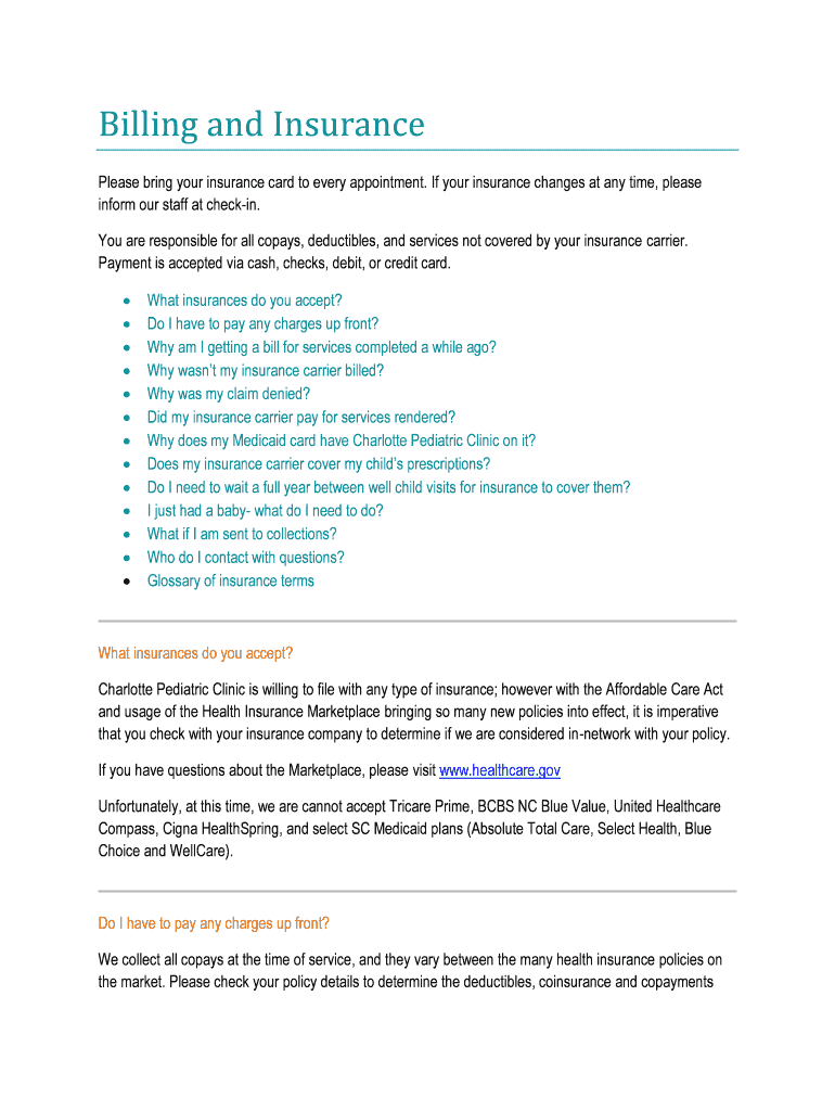 Billing and Insurance Please bring your insurance card to every appointment. If your insurance changes at any time, please inform our staff at checking. You are responsible for all copay, deductibles,