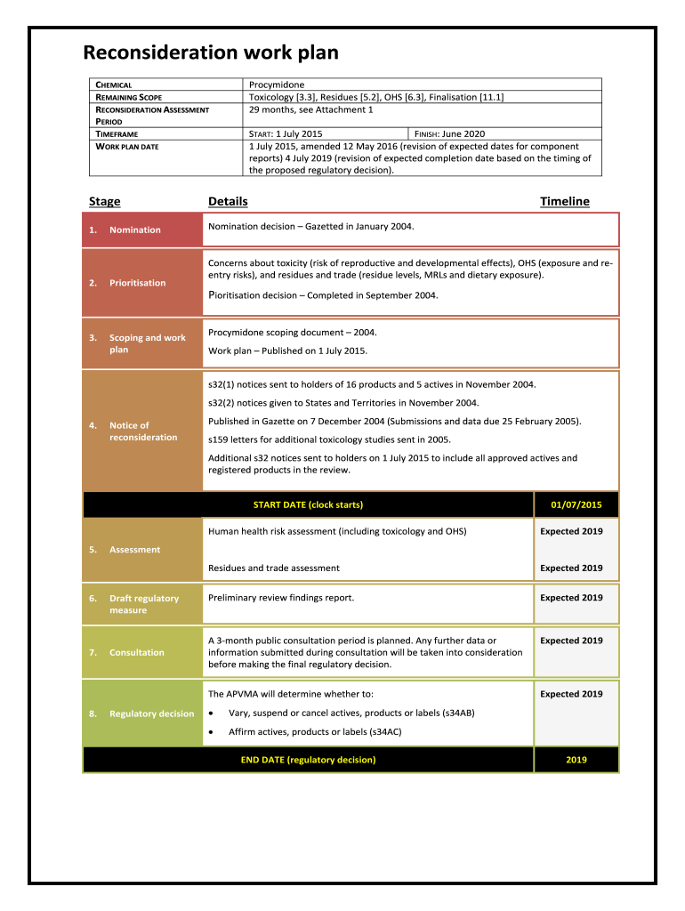Reconsideration work plan CHEMICAL REMAINING SCOPE RECONSIDERATION ASSESSMENT PERIOD TIMEFRAME WORK PLAN DATEProcymidone Toxicology 3.3, Residues 5.2, OHS 6.3, Finalization 11.1 29 months, see Attachment