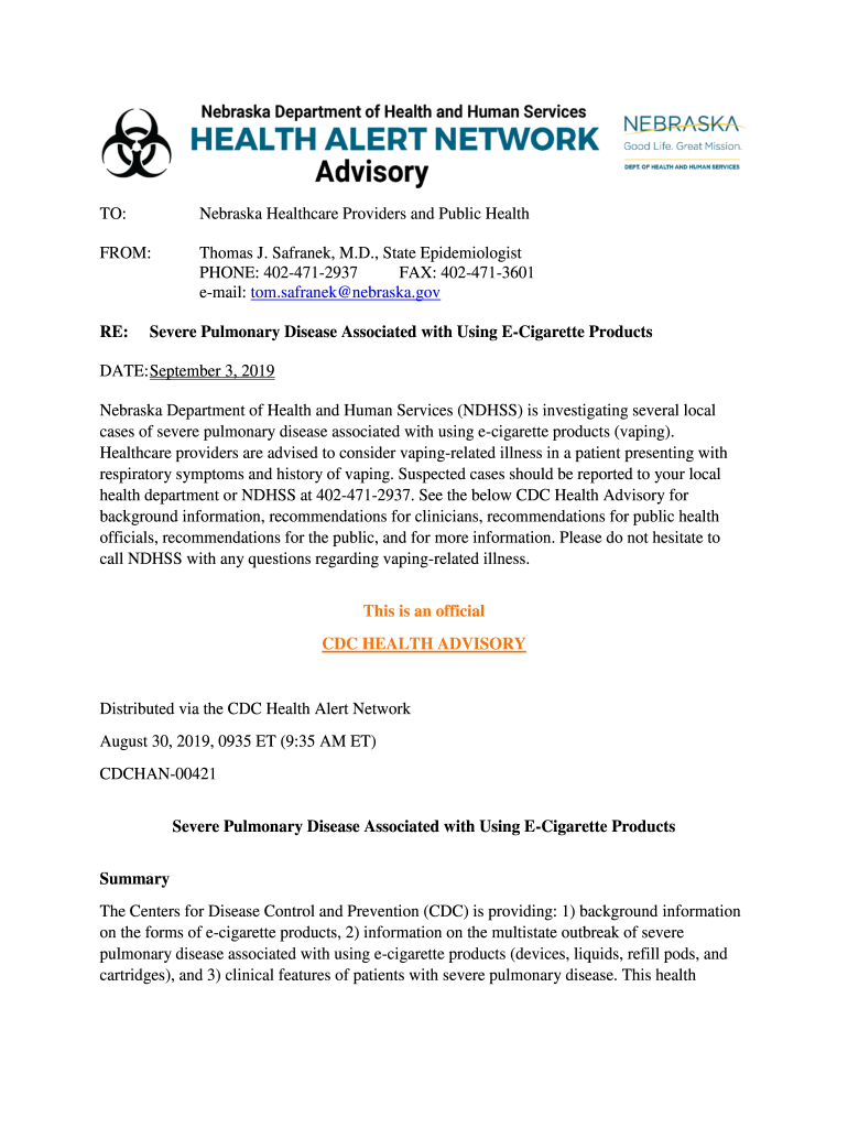 email: tom.safranek@nebraska.govRE:Severe Pulmonary Disease Associated
