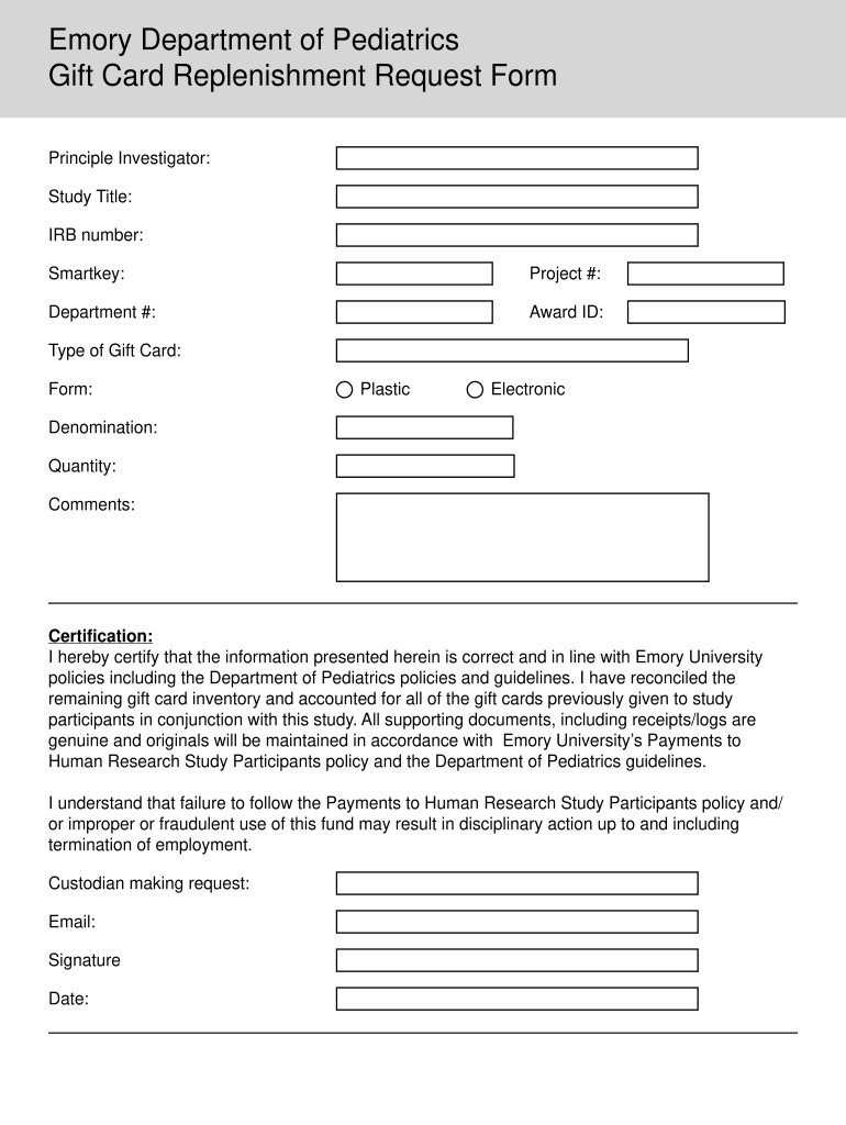 Get the free Emory Department of Pediatrics Gift Card Replenishment ...