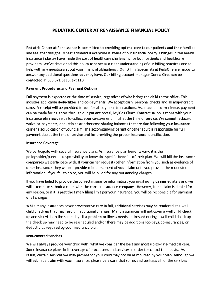 PEDIATRIC CENTER AT RENAISSANCE FINANCIAL POLICY