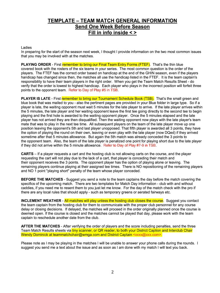 TEMPLATE TEAM MATCH GENERAL INFORMATION Send One Week Before Season Fill in info inside Ladies In preparing for the start of the season next week, I thought I provide information on the two most common