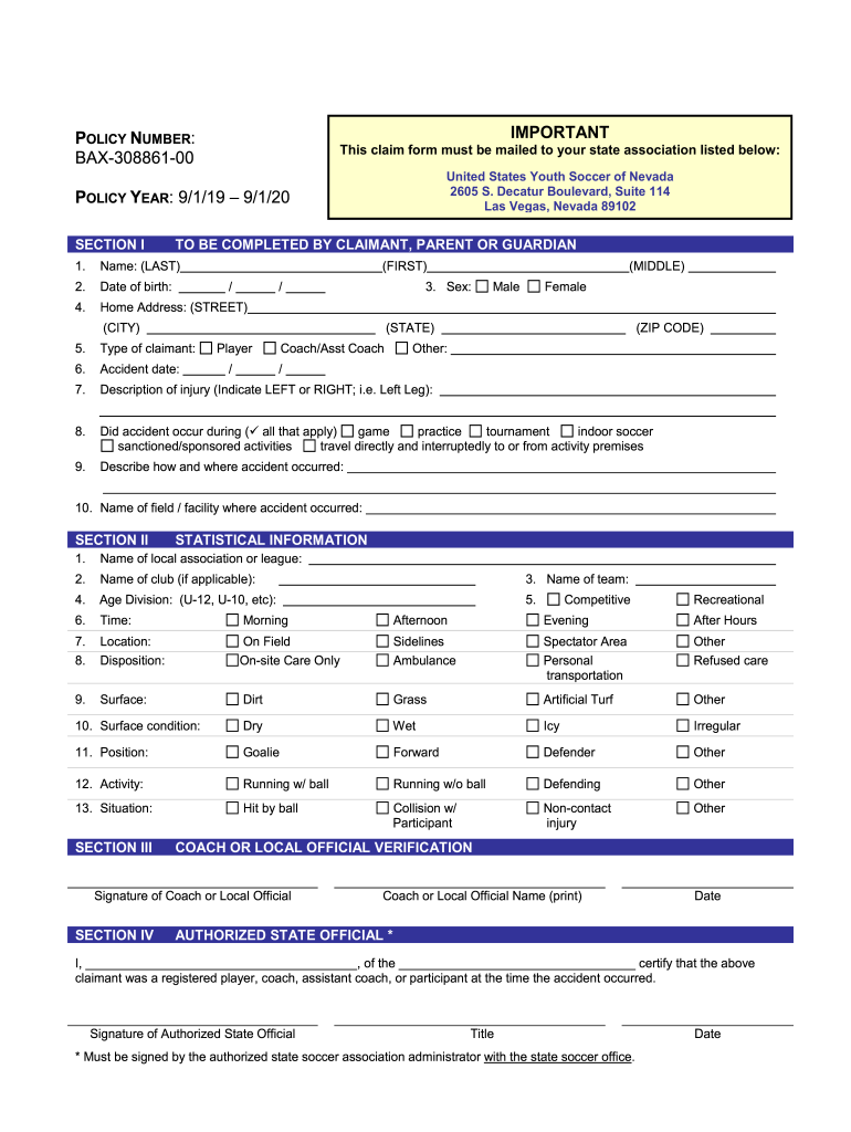 1. Complete ALL questions on the Youth Soccer Accident Claim Form.2. Have