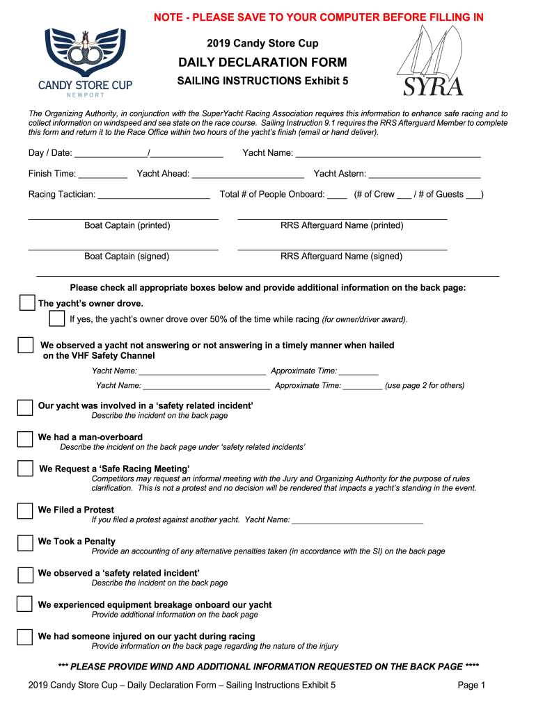 NOTE PLEASE SAVE TO YOUR COMPUTER BEFORE FILLING IN 2019 Candy Store Daily DECLARATION FORM SAILING INSTRUCTIONS Exhibit 5 The Organizing Authority, in conjunction with the Superfast Racing Association