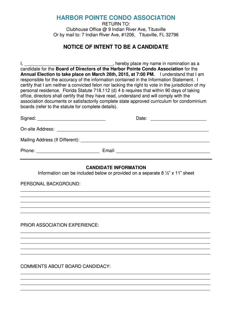 HARBOR POINT CONDO ASSOCIATION RETURN TO: Clubhouse Office 9 Indian River Ave, Titusville Or by mail to: 7 Indian River Ave, #1206, Titusville, FL 32796NOTICE OF INTENT TO BE A CANDIDATE I, hereby