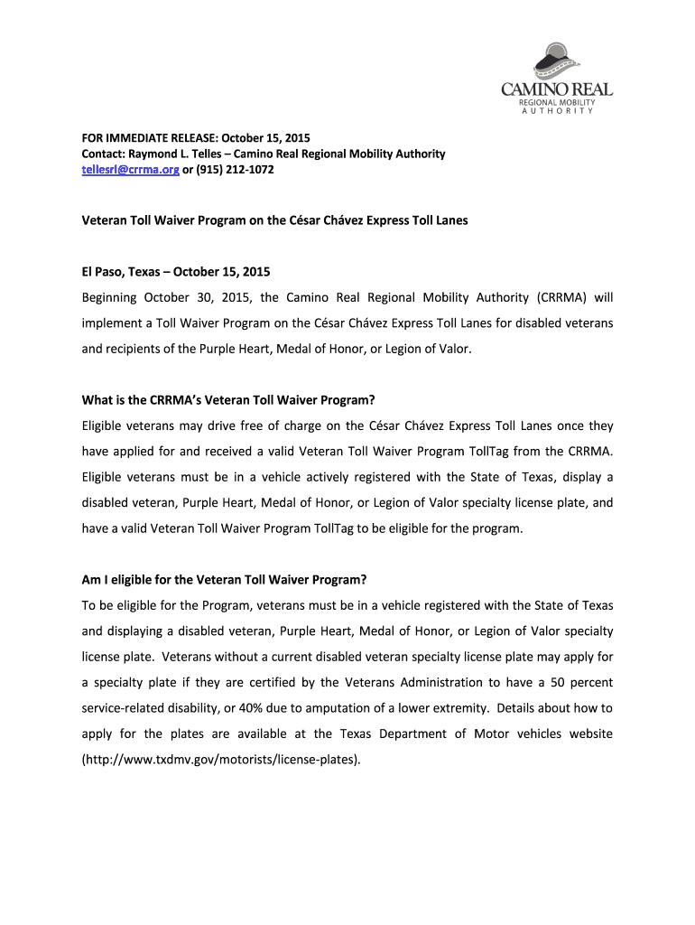 FOR IMMEDIATE RELEASE: October 15, 2015, Contact: Raymond L. Tells Camino Real Regional Mobility Authority teller drama.org or (915) 2121072Veteran Toll Waiver Program on the CSAR Chavez Express Toll