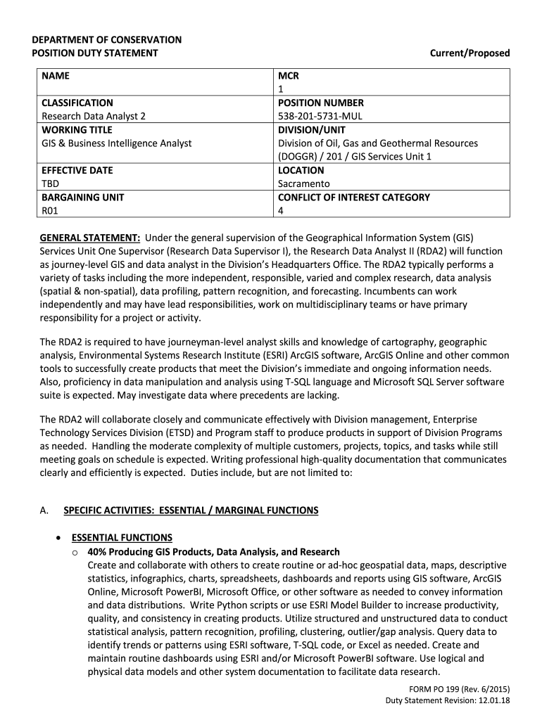DEPARTMENT OF CONSERVATION POSITION DUTY STATEMENT NAME CLASSIFICATION Research Data Analyst 2 WORKING TITLE GIS & Business Intelligence Analyst EFFECTIVE DATE TBD BARGAINING UNIT R01Current/Proposed