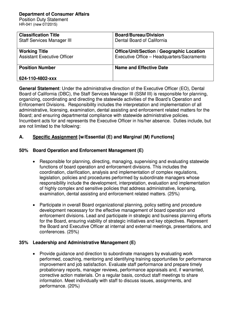 Department of Consumer Affairs Position Duty Statement HR041 (new 07/2015)Classification Title Staff Services Manager Inboard/Bureau/Division Dental Board of CaliforniaWorking Title Assistant Executive