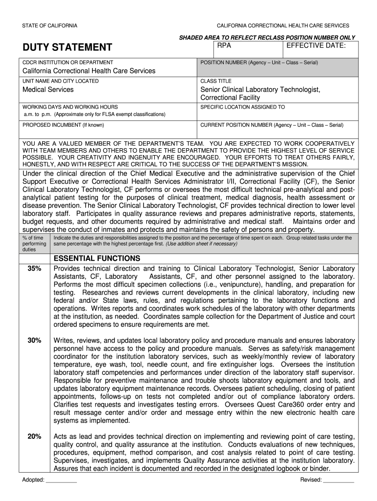 STATE OF CALIFORNIACALIFORNIA CORRECTIONAL HEALTH CARE SERVICESSHADED AREA TO REFLECT CLASS POSITION NUMBER ONLYDUTY STATEMENT CDC INSTITUTION OR DEPARTMENTRPAEFFECTIVE DATE:POSITION NUMBER (Agency