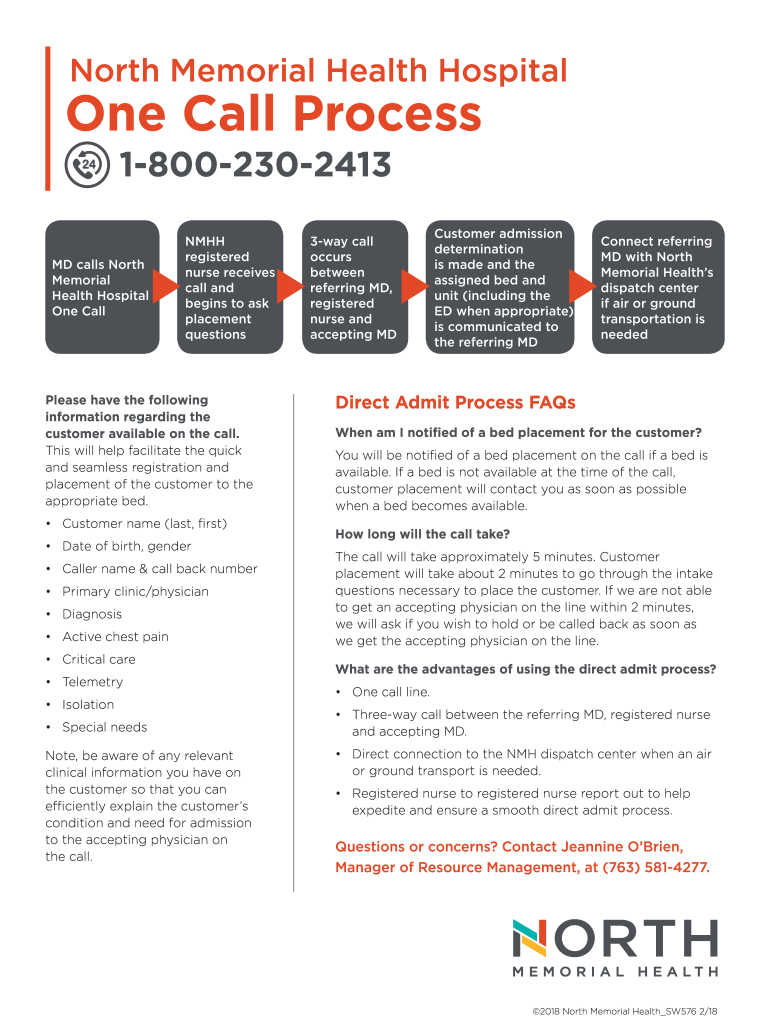North Memorial Health Hospitalize Call Process 18002302413MD calls North Memorial Health Hospital One Callum registered nurse receives call and begins to ask placement questionsPlease have the following