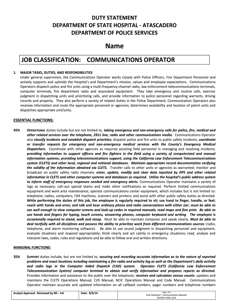 DUTY STATEMENT DEPARTMENT OF STATE HOSPITAL ATASCADERO DEPARTMENT OF POLICE SERVICESName JOB CLASSIFICATION: COMMUNICATIONS OPERATOR 1.MAJOR TASKS, DUTIES, AND RESPONSIBILITIES Under general supervision,