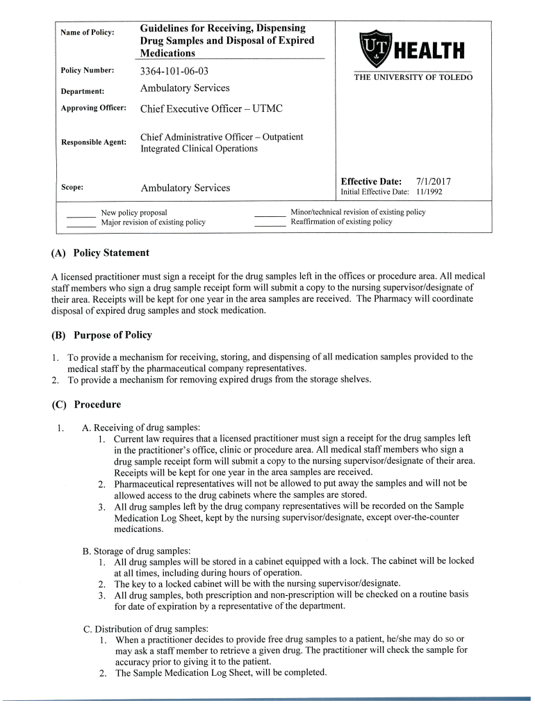 Name of Policy:Guidelines for Receiving, Dispensing Drug Samples and Disposal of Expired MedicationsPolicy Number:33641010603Department:Ambulatory ServicesApproving Officer:Chief Executive Officer