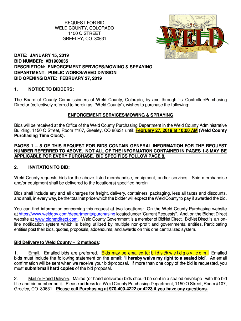 REQUEST FOR BID WELD COUNTY, COLORADO 1150 O STREET GREELEY, CO 80631DATE: JANUARY 15, 2019, BID NUMBER: #B1900035 DESCRIPTION: ENFORCEMENT SERVICES/MOWING & SPRAYING DEPARTMENT: PUBLIC WORKS/WEED
