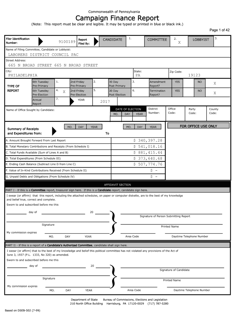 Commonwealth of PennsylvaniaCampaign Finance Report