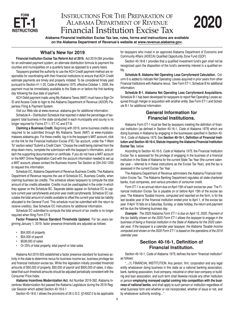 Alabama Department of revenueFinancial Institution excise tax2020Alabama Financial Institution Excise Tax law, rules, forms and instructions