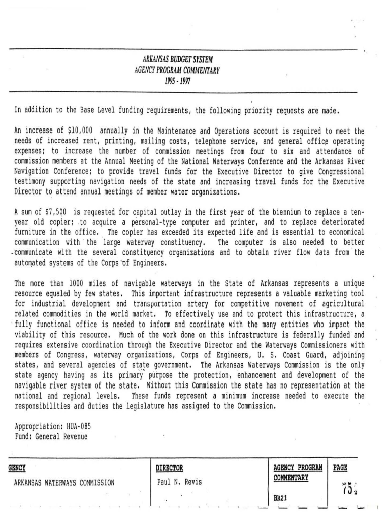 ARKANSAS BUDGET SYSTEM AGENCY PROGRAM COMMENTARY 1995 1997 In addition to the Base Level funding requirements, the following priority requests are made. An increase of $10,000 annually in the Maintenance