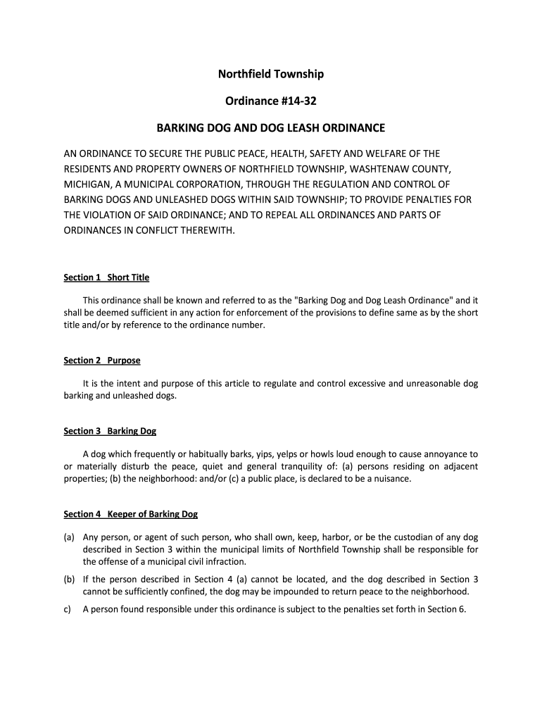 Get the free Northfield Township Ordinance #14-32 BARKING DOG AND DOG ...