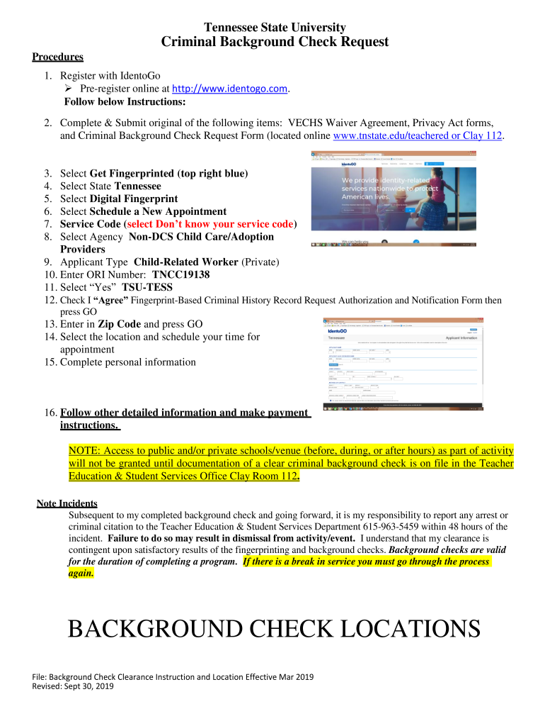Tennessee State UniversityCriminal Background Check Request Procedures 1. Register with Identity Preregister online at http://www.identogo.com. Follow below Instructions: 2. Complete & Submit original