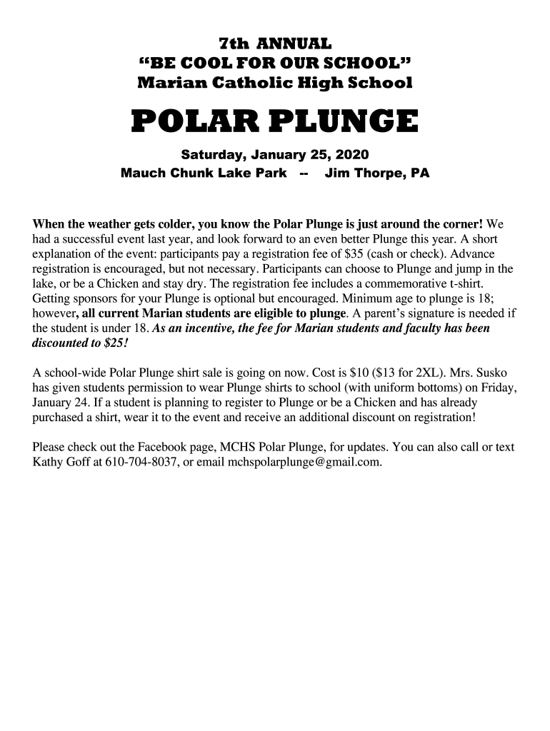 7th ANNUAL BE COOL FOR OUR SCHOOL Marian Catholic High SchoolPOLAR PLUNGE Saturday, January 25, 2020, Much Chunk Lake Park Jim Thorpe, PAW hen the weather gets colder, you know the Polar Plunge is