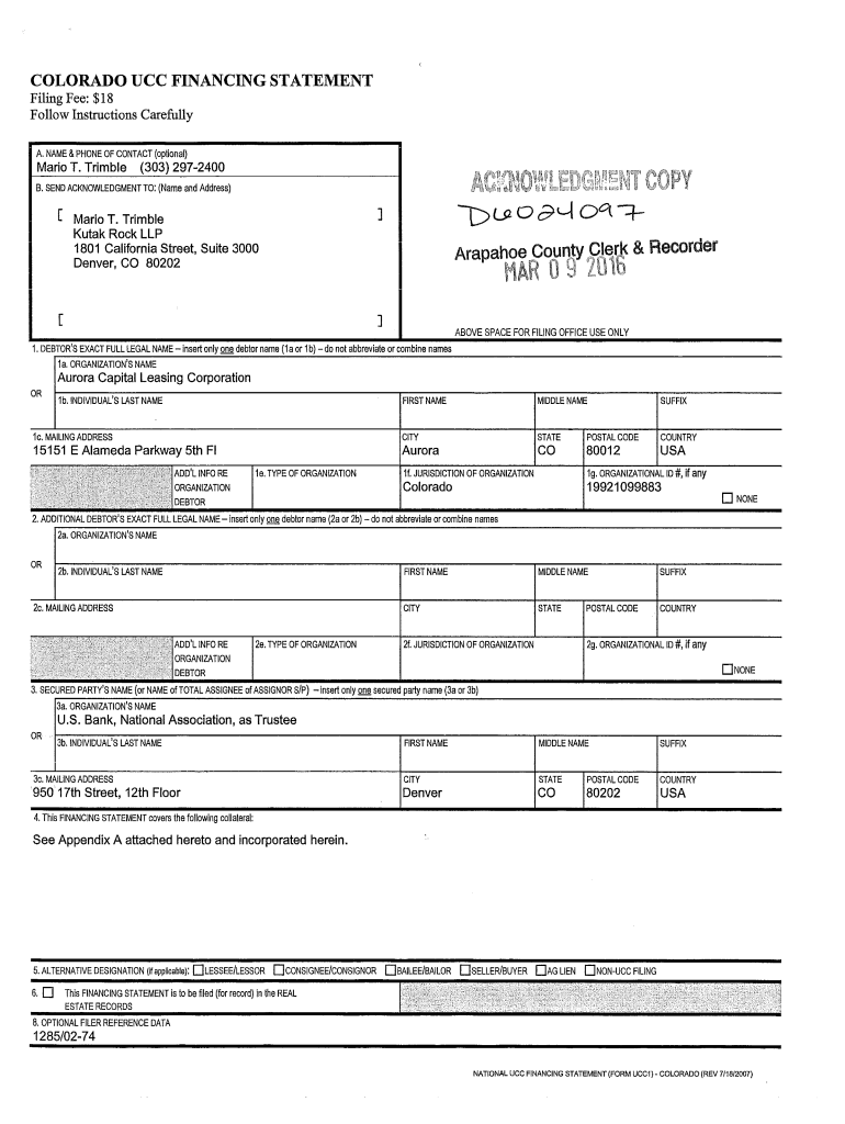 COLORADO UCC FINANCING STATEMENT Filing Fee: $18 Follow Instructions Carefully A. NAME & PHONE OF CONTACT (optional) Mario T. Trimble(303) 2972400B. SEND ACKNOWLEDGMENT TO: (Name and Address) Mario