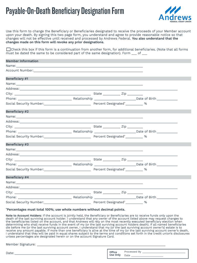Use this form to change the Beneficiary or Beneficiaries designated to receive the proceeds of your Member account