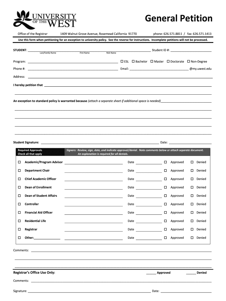 General Petition Office of the Registrar1409 Walnut Grove Avenue, Rose mead California 91770phone: 626.571.8811 / fax: 626.571.1413Use this form when petitioning for an exception to university policy.