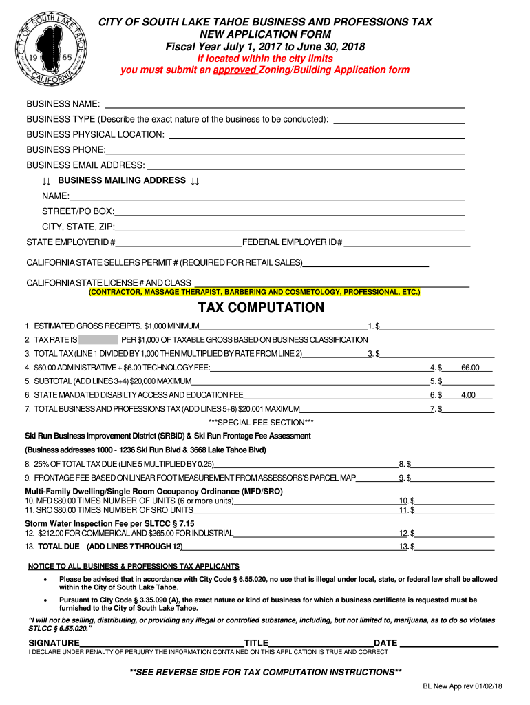 CITY OF SOUTH LAKE TAHOE BUSINESS AND PROFESSIONS TAX NEW APPLICATION FORM Fiscal Year July 1, 2017, to June 30, 2018, If located within the city limits you must submit an approved Zoning/Building