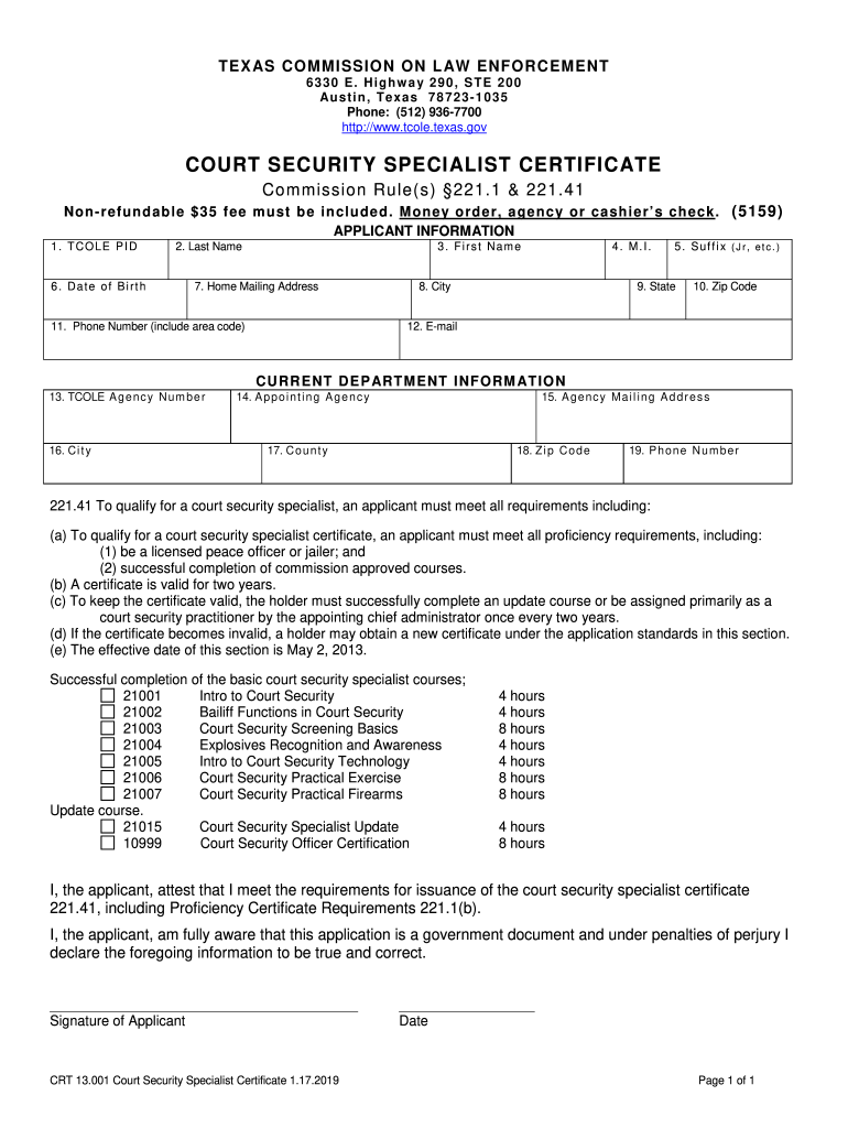 TEX AS COMMISSION ON L AW ENFORCEMENT 6330 E. Highway 290, STE 200 Austin, Texas 787231035 Phone: (512) 9367700 http://www.tcole.texas.govCOURT SECURITY SPECIALIST CERTIFICATE Commission Rule(s) 221.1