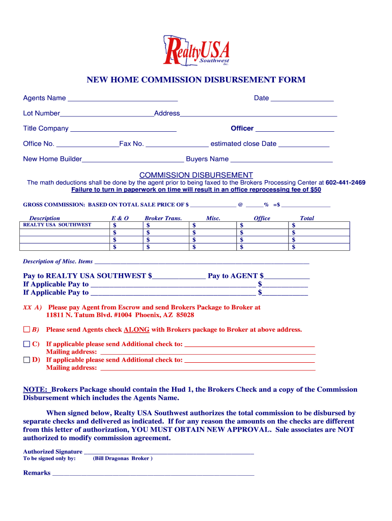 NEW HOME COMMISSION DISBURSEMENT FORM Agents Name Date Lot Number Address Title Company Officer Office No. Fax No. estimated close Date New Home Builder Buyers Name COMMISSION DISBURSEMENT The math