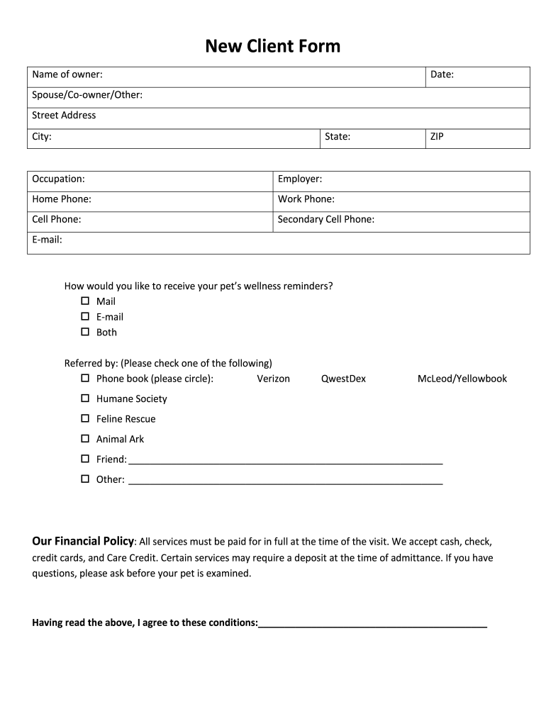 New Client Form Name of owner:Date:Spouse/Coowner/Other: Street Address City:State:Occupation:Employer:Home Phone:Work Phone:Cell Phone:Secondary Cell Phone:Email:How would you like to receive your