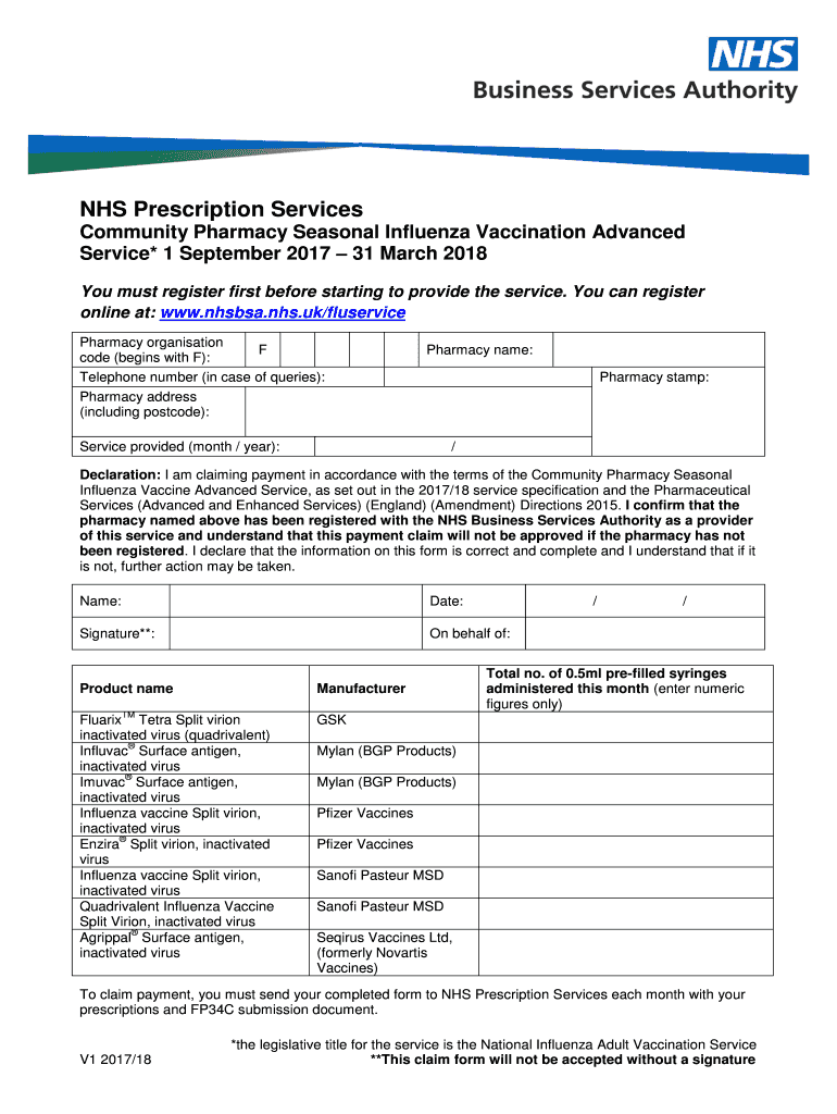 NHS Prescription Services Community Pharmacy Seasonal Influenza Vaccination Advanced Service* 1 September 2017 31 March 2018 You must register first before starting to provide the service. You can