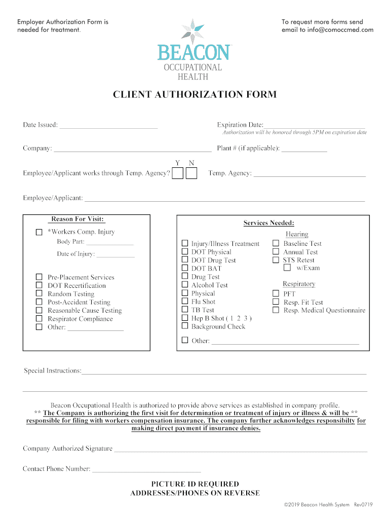 To request more forms send email to info compacted. Employer Authorization Form is needed for treatment. CLIENT AUTHORIZATION FORM Date Issued: Expiration Date: Authorization will be honored through