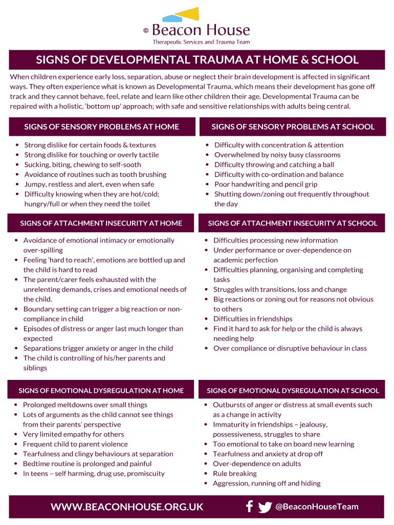 SIGNS OF DEVELOPMENTAL TRAUMA AT HOME & SCHOOL When children experience early loss, separation, abuse or neglect their brain development is affected in significant ways. They often experience what