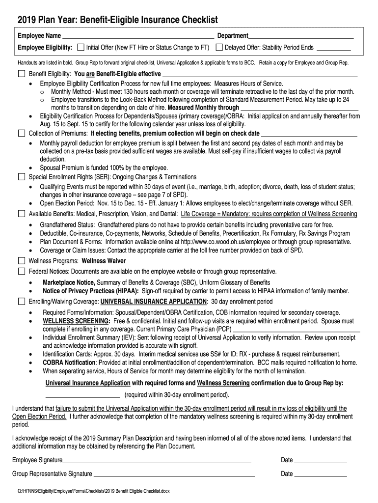 2019 Plan Year: BenefitEligible Insurance Checklist Employee Name Department Employee Eligibility:Initial Offer (New FT Hire or Status Change to FT)Delayed Offer: Stability Period Ends Handouts are