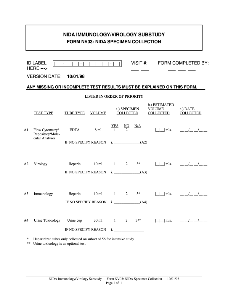 NIDA IMMUNOLOGY/VIROLOGY SUBSIDY FORM NV03: NIDA SPECIMEN COLLECTION ID LABEL HERE VISIT #: VERSION DATE:FORM COMPLETED BY: 10/01/98ANY MISSING OR INCOMPLETE TEST RESULTS MUST BE EXPLAINED ON THIS