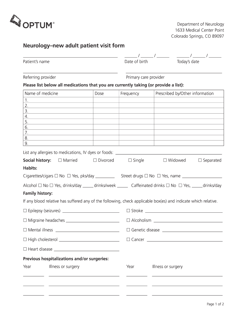 Department of Neurology 1633 Medical Center Point Colorado Springs, CO 89097Neurologynew adult patient visit form Patients name / / Date of birth / / Today's date Referring provider Primary care providerPlease