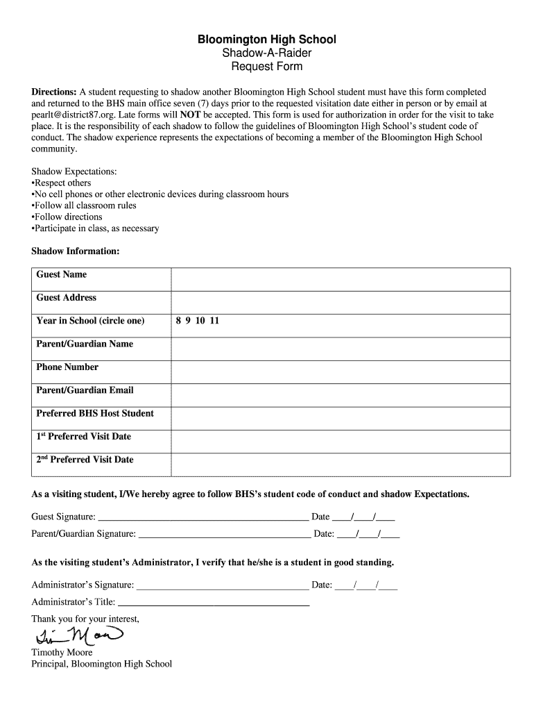 Directions: A student requesting to shadow another Bloomington High School student must have this form completed