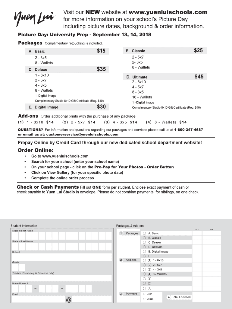 Visit our NEW website at www.yuenluischools.com for more information on your schools Picture Day including picture dates, background & order information. Picture Day: University Prep September 13,