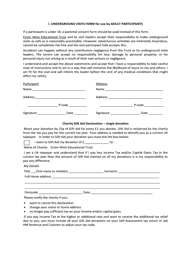 I. UNDERGROUND VISITS FORM for use by ADULT PARTICIPANTS