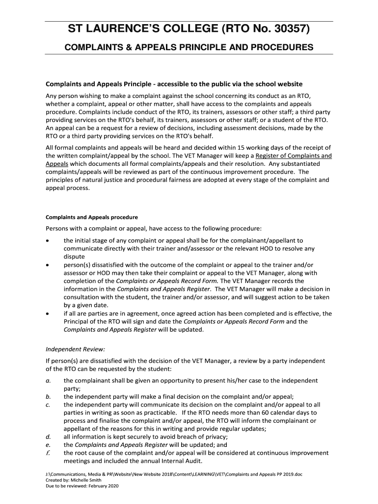ST LAURENCE COLLEGE (RTO No. 30357) COMPLAINTS & APPEALS PRINCIPLE AND PROCEDURESComplaints and Appeals Principle accessible to the public via the school website Any person wishing to make a complaint