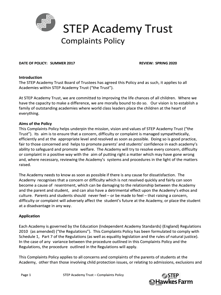 Get the free TEMPLATE Complaints Policy for MAT - Phoenix Academy