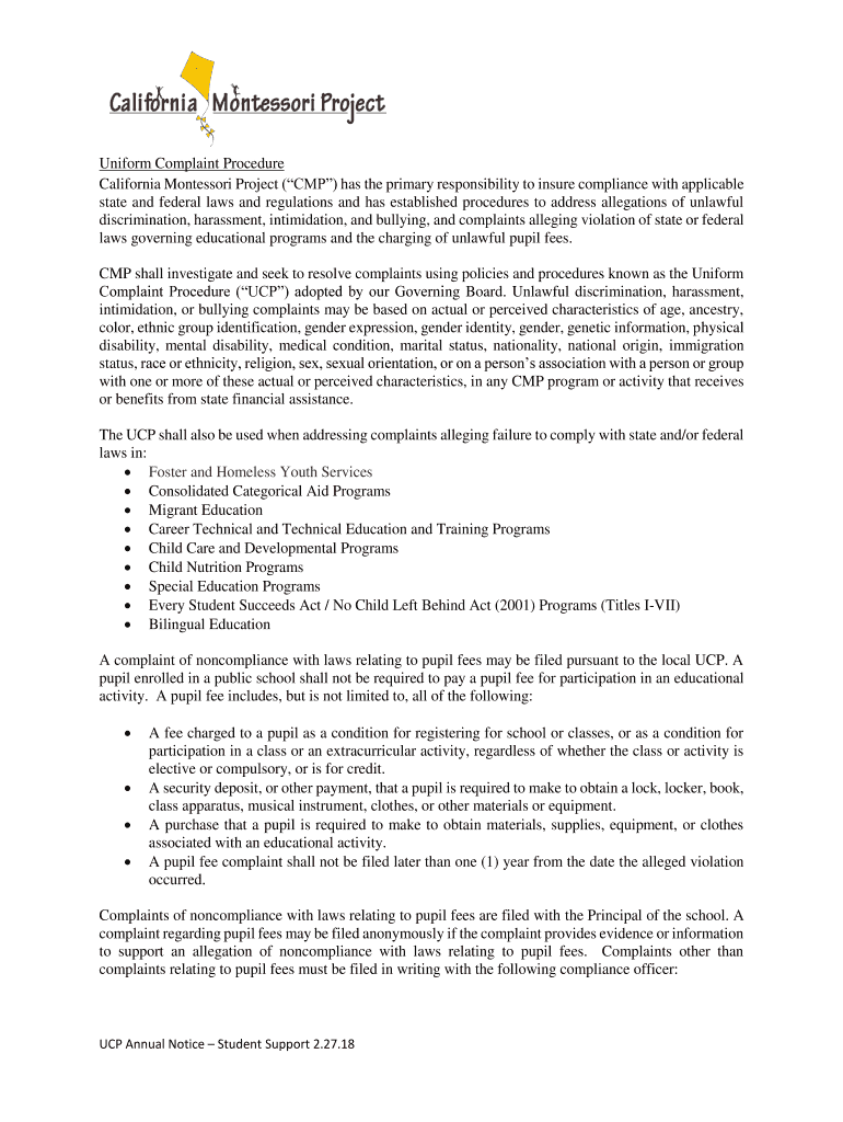 Get the free Annual Notice of the Uniform Complaint Procedure - California ...