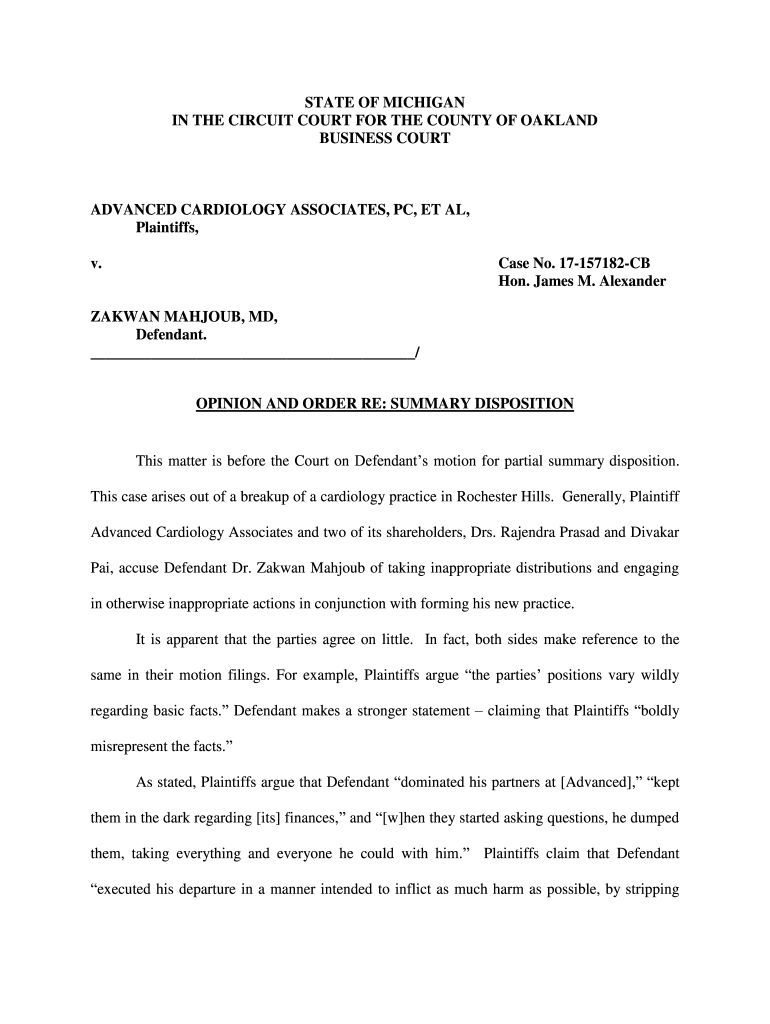 STATE OF MICHIGAN IN THE CIRCUIT COURT FOR THE COUNTY OF OAKLAND BUSINESS COURTADVANCED CARDIOLOGY ASSOCIATES, PC, ET AL., Plaintiffs, v. Case No. 17157182CB Hon. James M. AlexanderZAKWAN MAHFOUZ,