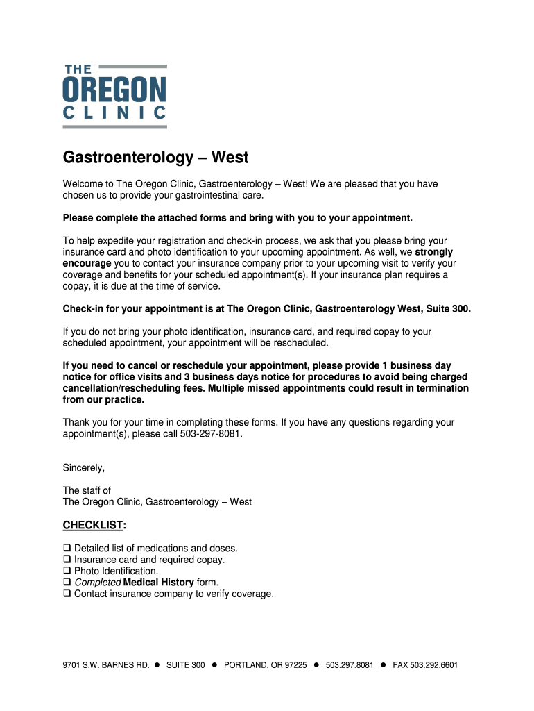 Gastroenterology West Welcome to The Oregon Clinic, Gastroenterology West! We are pleased that you have chosen us to provide your gastrointestinal care. Please complete the attached forms and bring